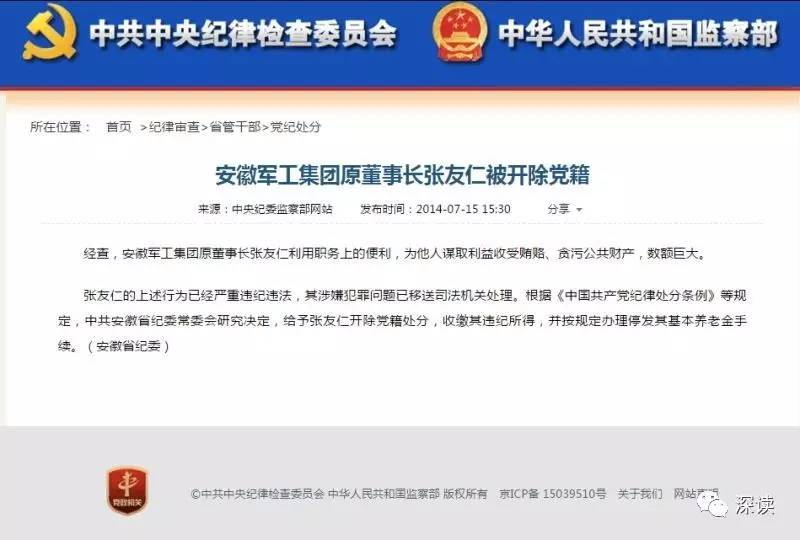 深读(微信ID:shenduzhongguo)记者了解到,2014年7月15日,中纪委监察部网站发布消息称,安徽军工集团原董事长张友仁被开除党籍,收缴违纪所得,并按规定办理停发基本养老金手续,其涉嫌犯罪问题已移送司法机关处理。