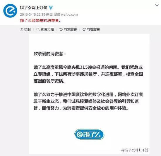 “饿了么”被曝光当天回应称,其高度重视问题,已经紧急成立专项组,下线所有涉事违规餐厅,并连夜部署,核查全国范围的餐厅资质。