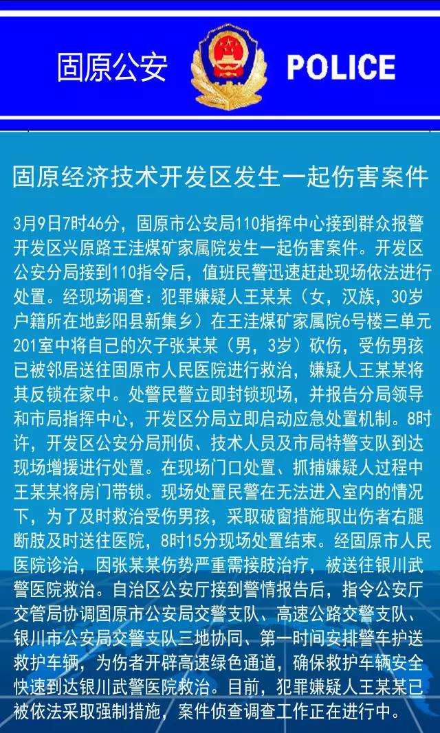 中国青年网北京3月10日电:3月9日上午,宁夏固原市开发区兴原路一居民小区发生一起伤害案件,一名30岁女子将3岁次子砍伤。固原市公安局官方微信当天报称,7点46分,固原市公安局110指挥中心接到群众报警,开发区兴原路一家属院,30岁女子王某某在室内将自己次子张某某砍伤,受伤男童被邻居送往医院进行救治。随后,民警破窗取出伤者右腿断肢送往医院。犯罪嫌疑人被依法采强制措施,案件侦查调查工作正在进行中。
