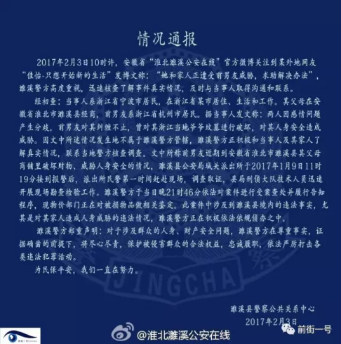 2月3日晚,濉溪县公安局官方微博通报称,经调查,王慧是浙江省宁波市居民,其父母于淮北市濉溪县经商,前男友系杭州市居民。