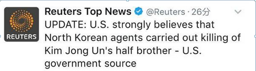 路透社称,美国政府坚信朝鲜谋杀了金正男。