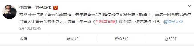 前两天,卓伟与其徒儿“狗仔大圣”在微博预告,2月13日将发布“周一见”,并提示拍到了明星出轨。