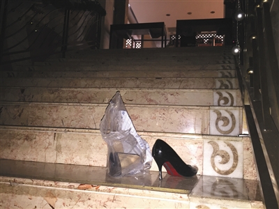 2016年12月28日,被查封的丽海名媛俱乐部台阶上遗留着一双高跟鞋。