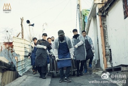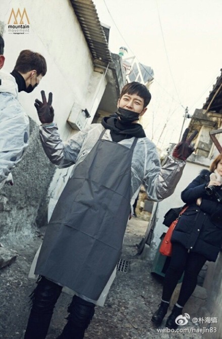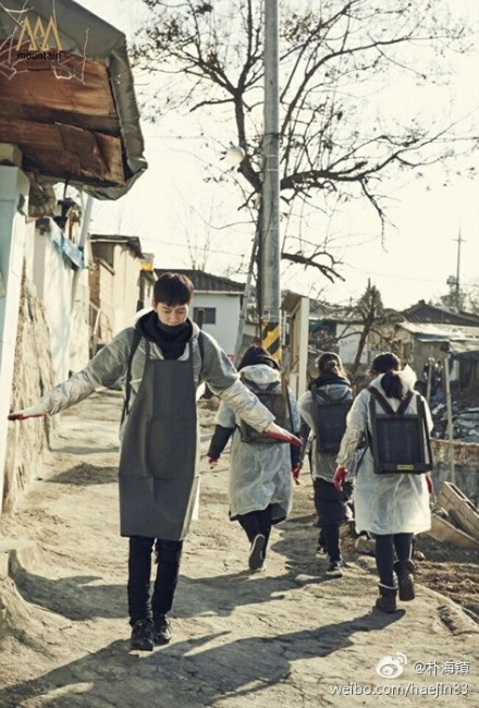 照片中的朴海镇与正在拍摄的 jTBC 电视剧《Man to Man》工作人员组队,齐心协力地在寒冬中一起搬运煤炭物资,尽管艰辛仍绽放灿烂的笑容。