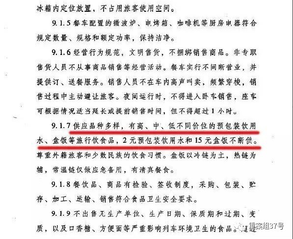 重案组37号(微信ID:zhonganzu37)注意到,2015年1月1日起施行的《铁路旅客运输服务质量规范》中,第九条“列车经营”的“餐饮经营”部分中,明确要求“供应品种多样,有高、中、低不同价位的预包装饮用水、2元预包装饮用水和15元盒饭不断供”。