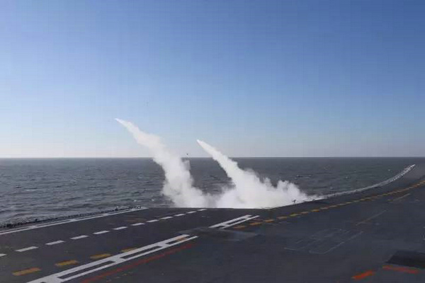 | 辽宁舰发射舰空导弹,拦截来袭目标。 |