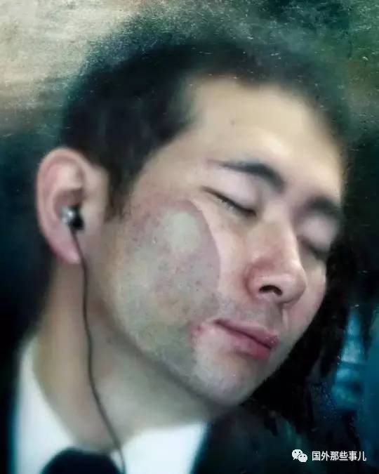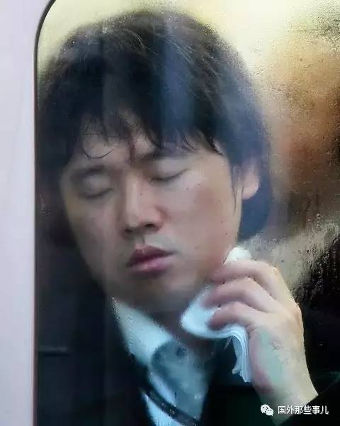 一位穿着西装的日本男子,脸贴着玻璃睡着了,日本人的工作压力在全世界数一数二。