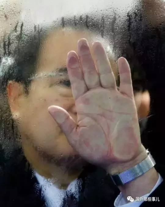 一位中年男人隔着玻璃看到摄影师在拍他,拿手挡住了脸。