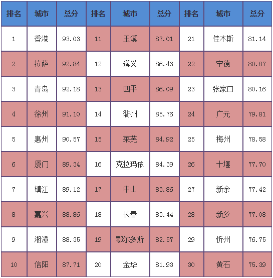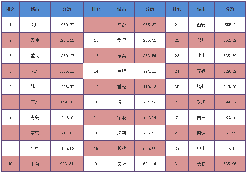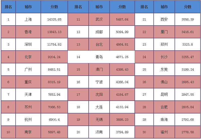 位列第四至第十名的城市分别是北京、广州、重庆、天津、苏州、杭州及南京。上海在该评比中已是连续4年排名首位。