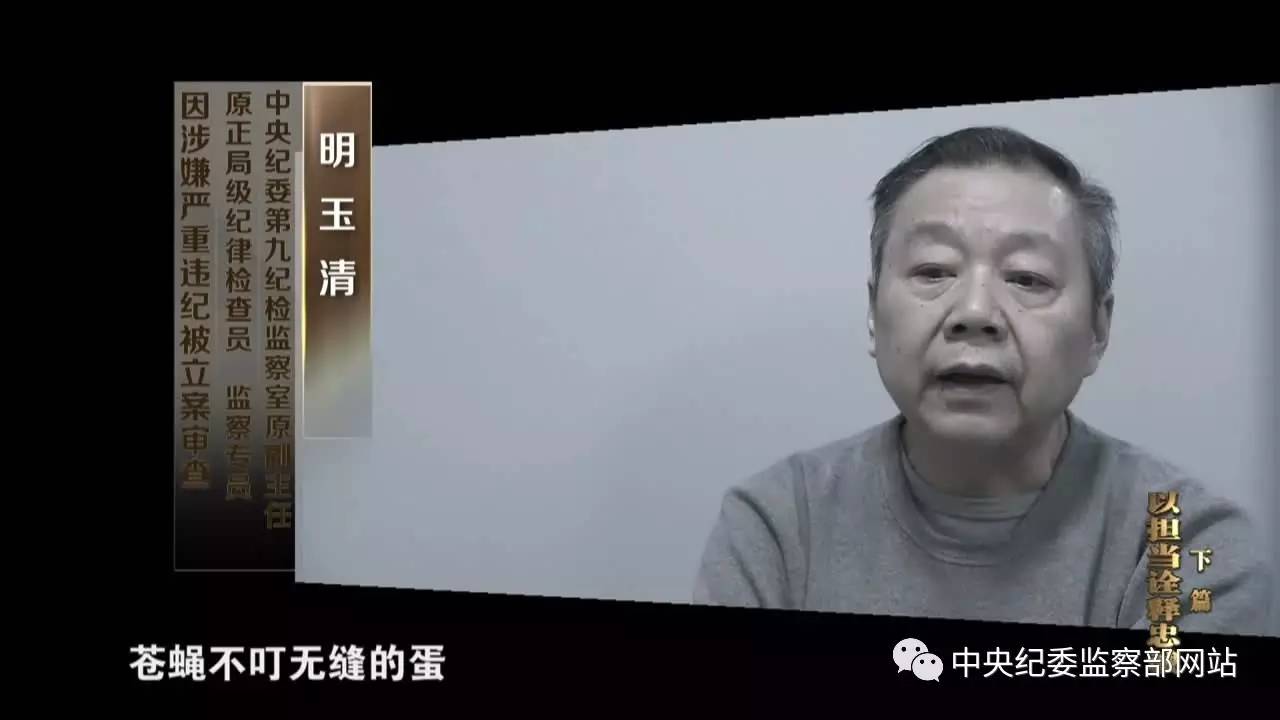 明玉清(中央纪委第九纪检监察室原副主任原正局级纪律检查员监察专员):我在这个机关工作27年了,一直都是张着嘴说别人,尤其是过去拿着镜子是照别人,没有照过我自己,现在回过头来对照自己,主要是私字,私心,贪。
