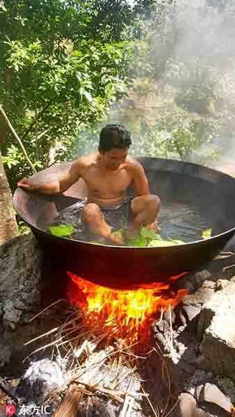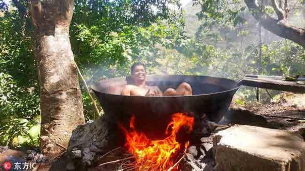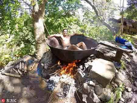 2017年1月3日报道(具体拍摄时间不详),菲律宾安蒂克省,这组震撼的照片显示,一名男子躺在一个大铁锅中,底下还生着火,像是要活生生煮了自己一样。