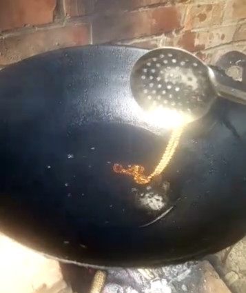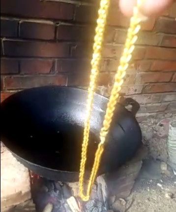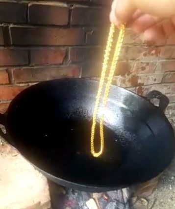 最近一名农村小伙子不知是炫富还是怎么的,突发奇想将脖子上的大金链子拿下来放进油锅里炸。