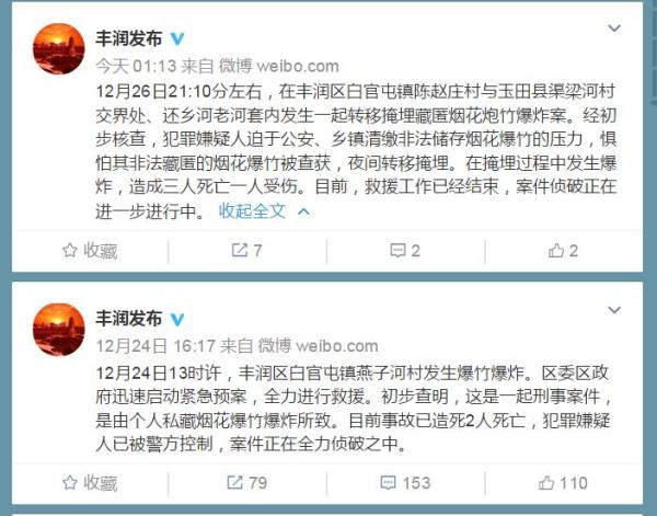此前,12月24日13时许,丰润区白官屯镇燕子河村发生爆竹爆炸。区委区政府迅速启动紧急预案,全力进行救援。初步查明,那是一起刑事案件,是由个人私藏烟花爆竹爆炸所致。目前该事故已造死2人死亡,犯罪嫌疑人已被警方控制,案件正在全力侦破之中。