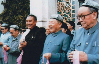 习仲勋(右二)与乌兰夫(右一)、第十世班禅(右三)、赛福鼎.艾则孜(右四)、杨静仁(右五)在北京民族文化宫。图片来源:中国西藏网