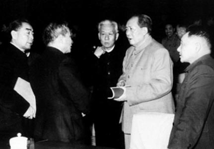 1962年七千人大会间隙,毛泽东、刘少奇、周恩来、邓小平、陈云等在一起交谈。 资料图