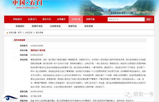 在石门县政府网站上,石门县公安局回复该来信称,经查,来件人反映情况基本属实,县公安局南镇派出所已受理并立为刑事案件,目前已经抓获并刑事拘留2人,案件在进一步侦办中。11月1日,前街一号记者联系到石门县公安局和南北镇派出所,对方均表示,目前案件在侦办中,具体案情不便对外透露。