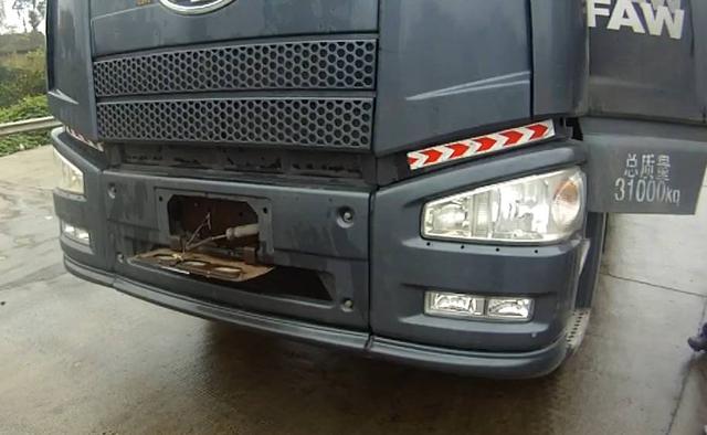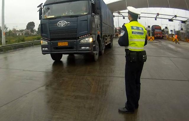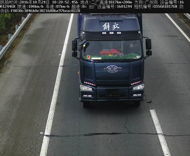 10月24日,省高警公安大队民警在二广高速东岳庙卡口执勤时,通过卡口监控系统抓拍的图片发现一辆解放牌重型货车的号牌竟然是“卧倒”状态,车号无法识别。