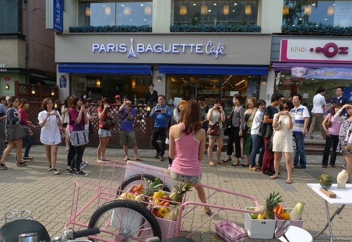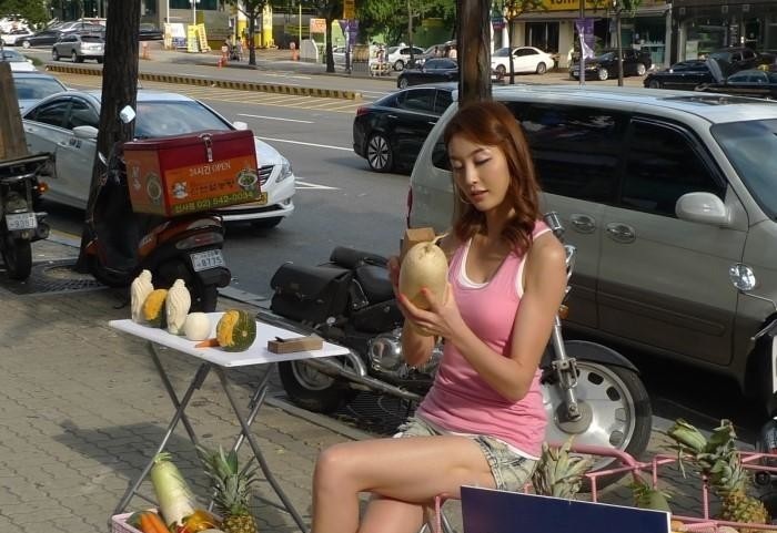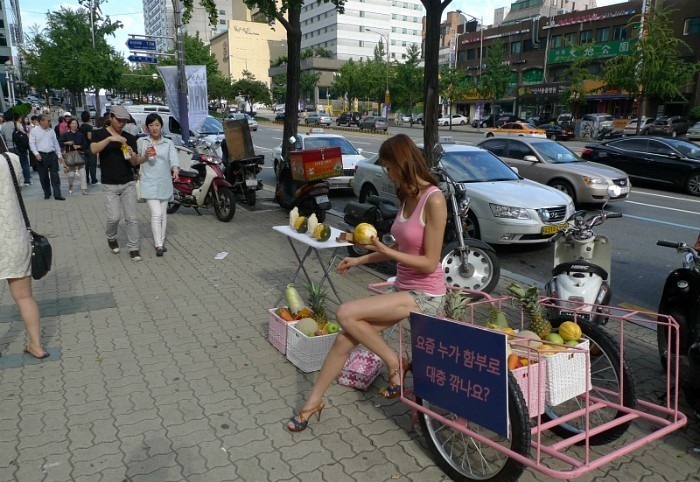 在韩国路边出现了这样一幕,一个穿着性感的美女推着三轮车出来卖水果,当人们以为她是靠美色吸引路过的人买水果时,靠近一看才知道人家靠得是实力。