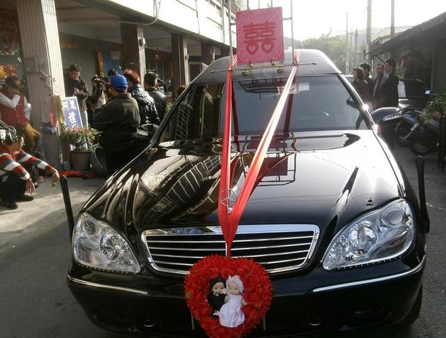 台湾的一对新人就选择了用”灵车“当婚车,赚足了眼球。这辆老款奔驰S级”灵车“车头悬挂着鲜红的花束,车身也是红色丝带缠绕。而原本用来放置逝者头像的车顶,此时用”红双喜”代替,洋溢着喜悦。