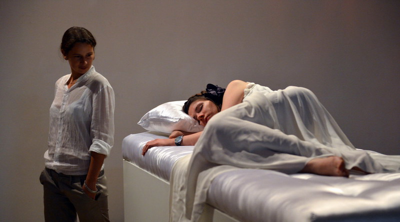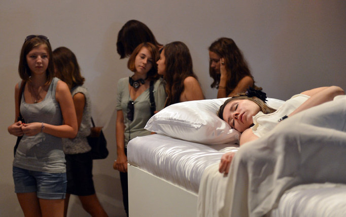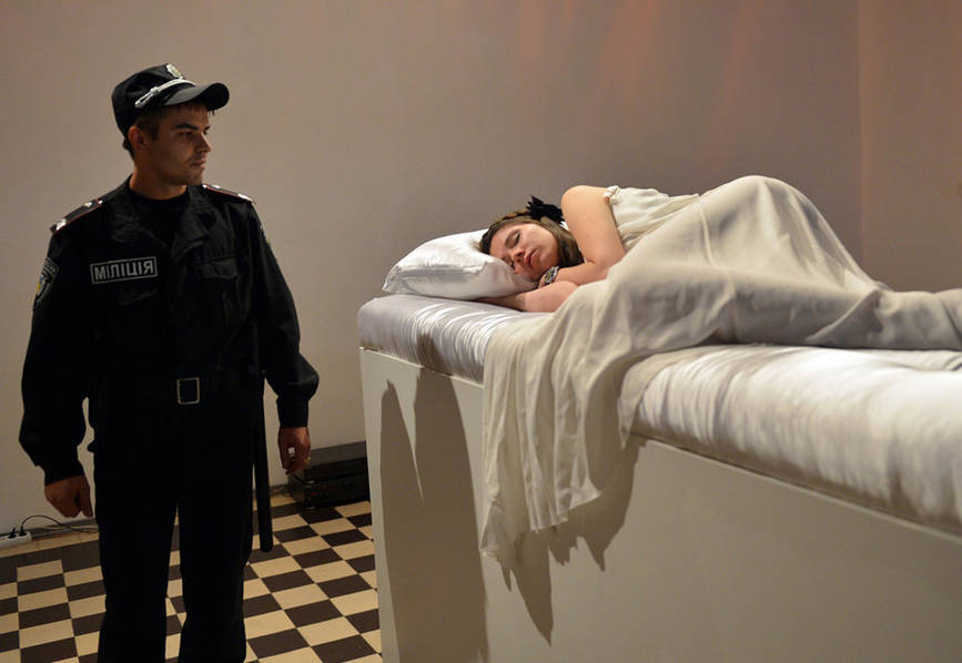 近日,乌克兰举办了一场史无前例的“睡美人”展览会。在展会上,一共有五位美丽的“睡美人”睡在床上,如果你可以吻醒她,就可以把她娶回家。