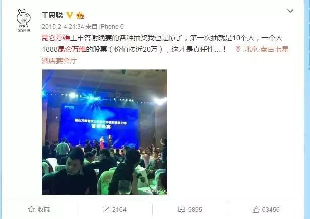在上市后,举办了答谢晚宴,面向对象为媒体与昆仑游戏多年来的合作伙伴。而在这次会议中,刚上市的昆仑万维可谓是大手笔,每位来宾皆可现场抽取昆仑万维股票。