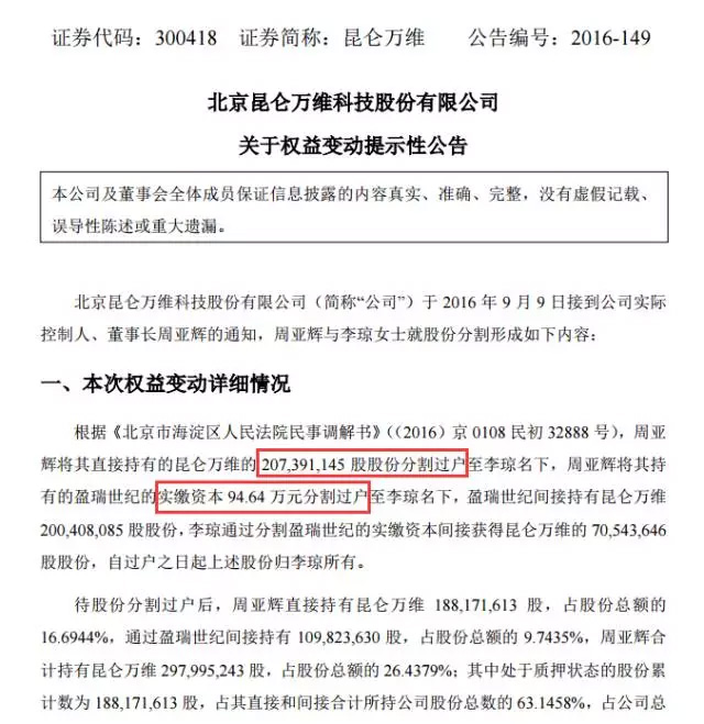 据昆仑万维公告,公司于9月9日接到公司实际控制人、董事长周亚辉的通知,周亚辉与妻子李琼女士就股份分割达成了相关内容。据《北京市海淀区人民法院民事调解书》显示,周亚辉将其直接持有昆仑万维的2.07亿股分割过户至李琼名下,周亚辉将其持有的盈瑞世纪的实缴资本94.64万元分割过户至李琼名下。
