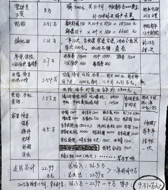 回家或半路的买胎修车,开工资,买保险,车辆当年折旧…这都是开支。