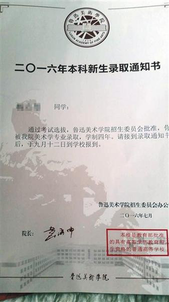 在今年的高考中,哈尔滨市第十九中学考生杨默总分470分,高出黑龙江省本二录取线近70分,顺利被鲁迅美术学院(以下简称鲁美)提前批次美术学专业录取。然而,收到录取通知书不到三天,她便接到了来自黑龙江省招生考试院的电话。工作人员田继斌告诉她,由于其美术统考成绩不合格,不具备录取资格,因此,杨默手中的鲁美录取通知书“作废”。