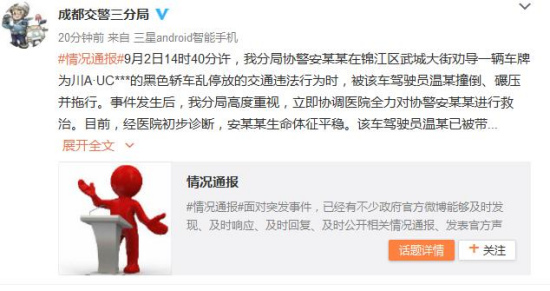 成都交警三分局表示,事件发生后,成都交警三分局高度重视,立即协调医院全力对协警安某某进行救治。