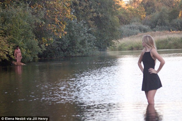 在其中一张照片中,吉莉安双手插腰,回头看到一名裸体男子和他的狗,表现出很震惊的样子。另一张照片中,吉莉安看到河对岸的裸体男和他的狗,露出微笑的表情。