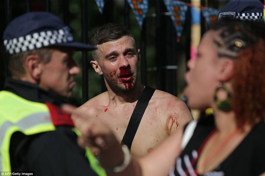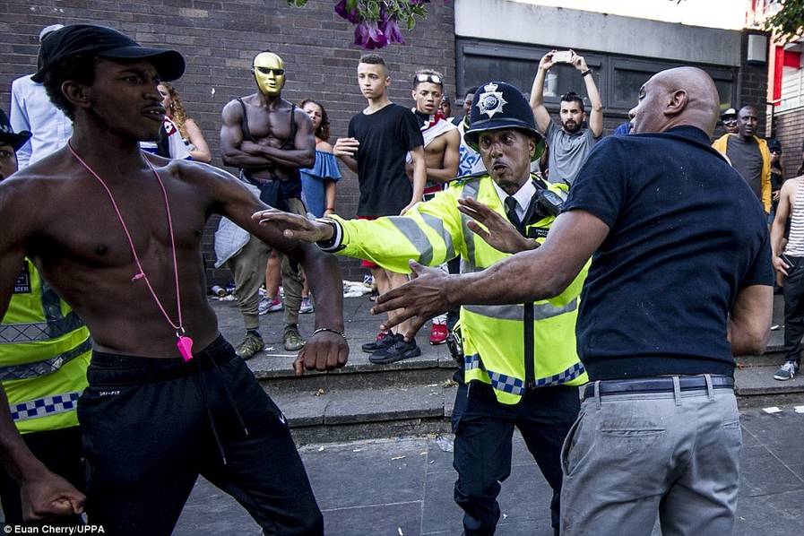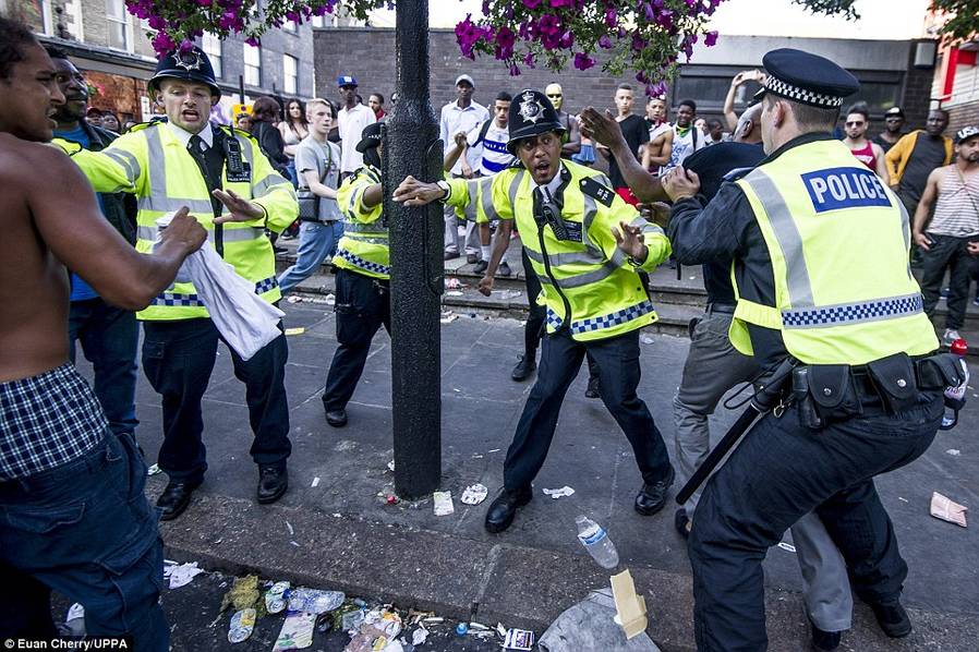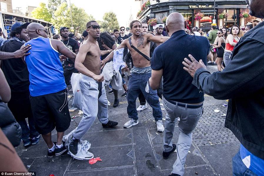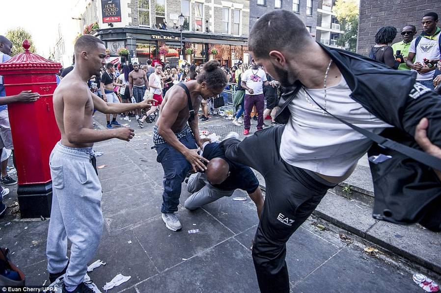 诺丁山狂欢节今年庆祝50周年,一如以往有大型巡游,整个街头挤满穿五颜六色衣服的狂欢者,有参加者悉心打扮,穿戴羽毛头饰、彩虹服装翩翩起舞。同时,两日节庆中发生多宗暴力事件,从照片可见,有参加者遭其他人踢跌在地上,也有不少人身体不适躺在地上。警员忙于调停各种纷争。