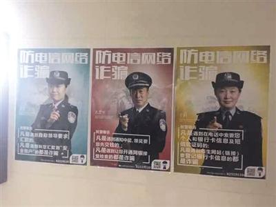 昨晚,蓝旗营小区8号楼一楼电梯口处张贴了多张“防电信网络诈骗”的宣传海报。新京报记者 周佳琪 摄