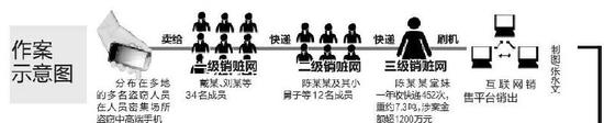 关杰介绍,在西安的陈某某和陈某等12名“二级销赃”网成员收到盗窃来的手机后,通过银行转帐等形式付款,又将手机快递到在广东深圳一大型电子市场的第三级销赃者。随后,第三级销赃者会对手机进行刷机,再通过互联网平台以新手机对外销售。