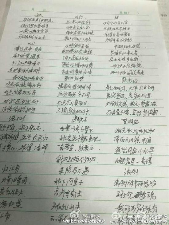 据@西安传媒微生活 爆料,陕西商贸学院最近举行了一次国学经典背诵古诗活动之后,老师直接让没背过的学生把120首古诗每首抄50遍,50分以下的抄2400遍。周三交作业,如果不抄,学校就不给发放今年的国家补助金1800块。