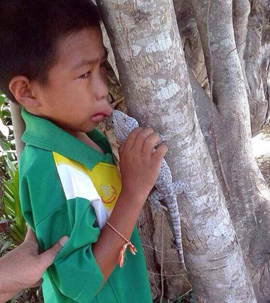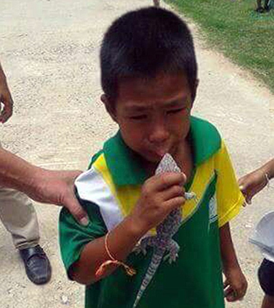【环球网综合报道】据英国《每日邮报》6月21日报道,在泰国北部南邦市,有一个小男孩不幸被一只大壁虎咬住了嘴唇。执着的壁虎怎么都不肯松开嘴,让小男孩很是痛苦绝望。