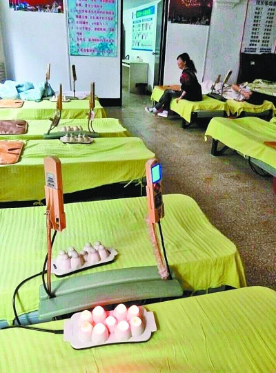 机构内摆放着十几张体验床,床上发光的小球,工作人员称是岫岩玉制成,有“神奇效果”。