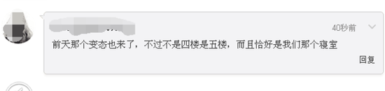 随后,记者电话联系上了女生小娟(化名),小娟介绍:“5月12号凌晨3点,我半夜突然醒来,发现一个男子站在对面床的位置,半弯着腰,只穿一条短裤。”小娟说,看 到这个男的后,她先是震惊后来大喊一声,“有男的进来了”,寝室人也全部醒了,男子立即冲了出去,大家赶紧把宿舍门锁起来了。事情发生后,寝室的同学都不 敢睡觉,“从凌晨3点起来就没有睡了,睁眼到天亮。”大家先后拨打了110报警和学校保卫处电话,“4、5点的时候警察和保安全部来了。”