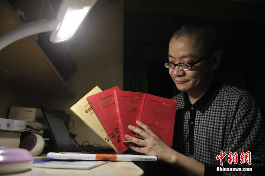 4月5日晚,重庆合川区一位45岁父亲正在家里卧室翻阅高考复习资料。据悉,时隔28年后的他再次报名参加高考,为的是给正在上高中二年级的儿子做榜样,激励自己的儿子要认真学习。