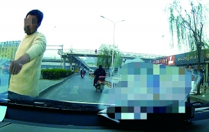 北京晨报记者从刘先生的行车记录仪拍摄的视频中看到,截车男子五十岁上下,身着米黄色上衣。他在距离刘先生车几十米开外的地方就招手示意,车靠近后他直接走到车前边走边用手指着车内,刘先生鸣笛他也丝毫没有躲让之意。刘先生见此情形无奈停车,随后那名男子一边敲打车头左前方边与刘先生“交涉”。