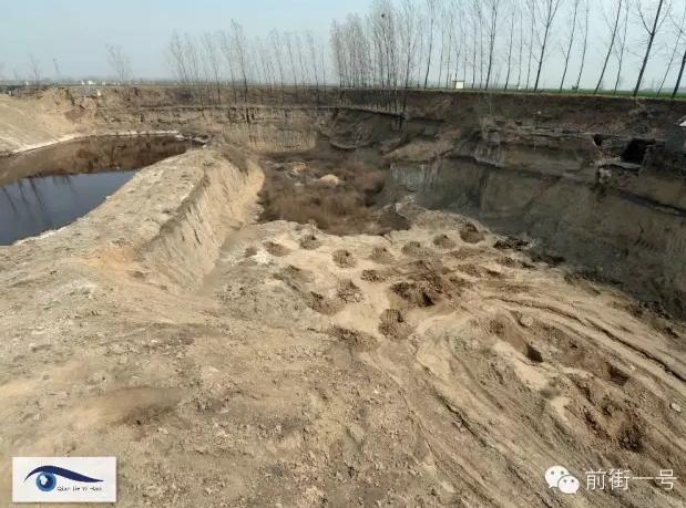 通过卫星地图观察,在张侯村西北侧一公里远的位置,一片平坦开阔的耕地中间,一片裸露着黄土的深坑显得格外刺眼。大坑东西长250多米、南北宽50余米,在深坑的东侧边缘,一片200多平方米的土地显示着刺眼的褐色,与周边绿油油的耕地显得格格不入。