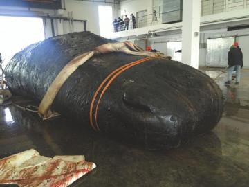 16日经打捞上岸,这头抹香鲸身长15.1米,重达约50吨,随后也被运至“人工岛”处理。