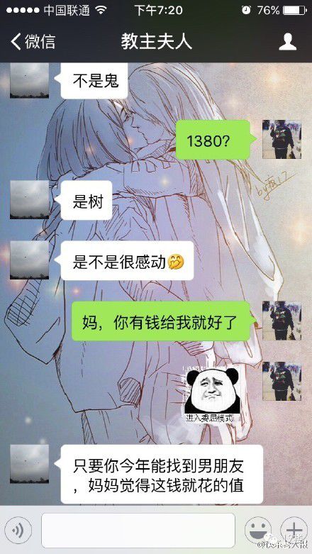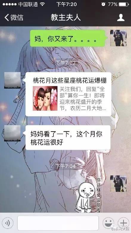 俩人的对话简直就是行走的网络梗。“帮你看了一下,这个月你桃花运很好”,无奈的刘小姐只好祭出表情包“你这样会没朋友”,可爱的刘妈妈说:“妈妈就是你的朋友。”