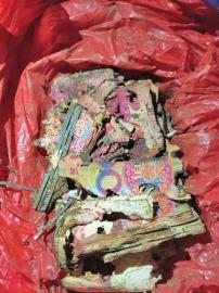 这两包钱渣渣,共计两万元整,之前都埋于地下。直到三天前,他突然记起,挖出它们时,发现两万现金已被白蚁啃成碎片。