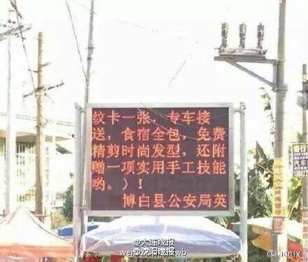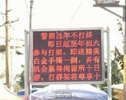爆料称,一电子显示屏上打出”即日起至年初六参与打架,即送精美白金手镯,并有机会赢得拘留所十日游……文末署名博白 县公安局(广西玉宁市博白县)。网友:现在不会写段子都不好意思干警察噜!