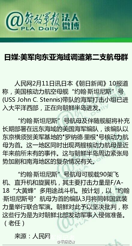 @军报记者:【日媒:美军向东亚海域调遣第二支航母群】美国核动力航空母舰“约翰·斯坦尼斯”号(USS John C. Stennis)带队的海军打击小组已进入大平洋西部,正在向朝鲜半岛进发。该编队以东京横须贺美军基地的"罗纳德·里根"号核动力航母为首。这一地区同时出现两艘核动力航母是近年来前所未有的事件。