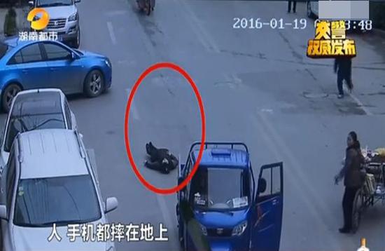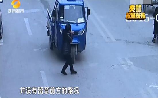 1月19日上午,在湖南娄底,一名打手机的女子过马路时,被一辆三轮车撞到当场身亡,而这位三轮车驾驶员,确实因多看了一看路旁的美女 走 神,酿成这起惨剧。目前他已被刑事拘留。图为三轮车撞倒打电话的女子。