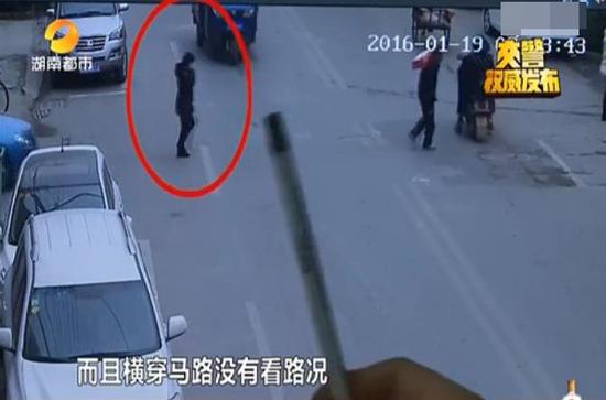 监控显示,当天上午的9点48分,64岁的李女士买完大米准备横穿马路回家,结果 遭遇横祸。这个就是当时在事故当中的受害者,她掏出了一个手机在接打电话,而且横穿马路没有看路况,与一辆三轮车发生了碰撞。通过这个慢放放大镜头可以看 到,一个身材高挑、衣着时髦的年轻女子从这里经过了马路。
