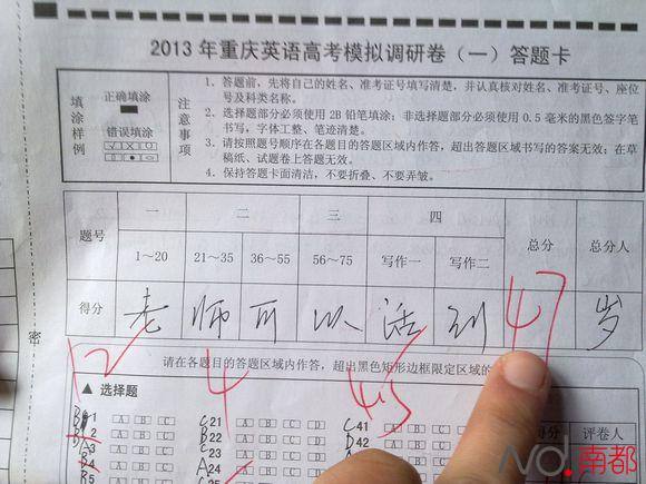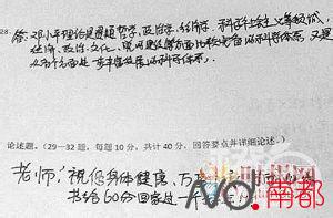 结果阅卷老师说:“虽然看到这样的祝福语,让我心情不像刚看到卷子那么糟糕了,但是大片空白还是让我无法给出‘人情分’。”
