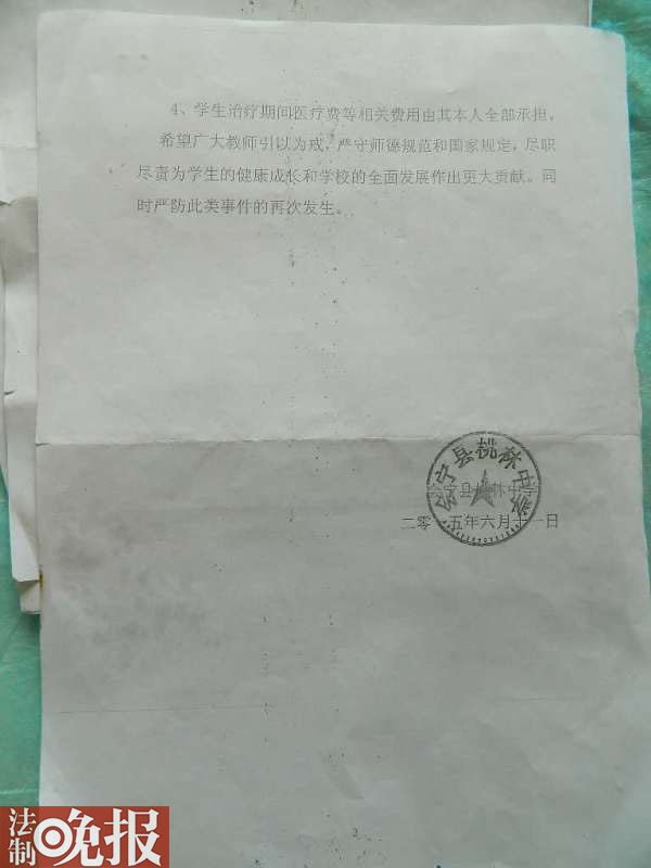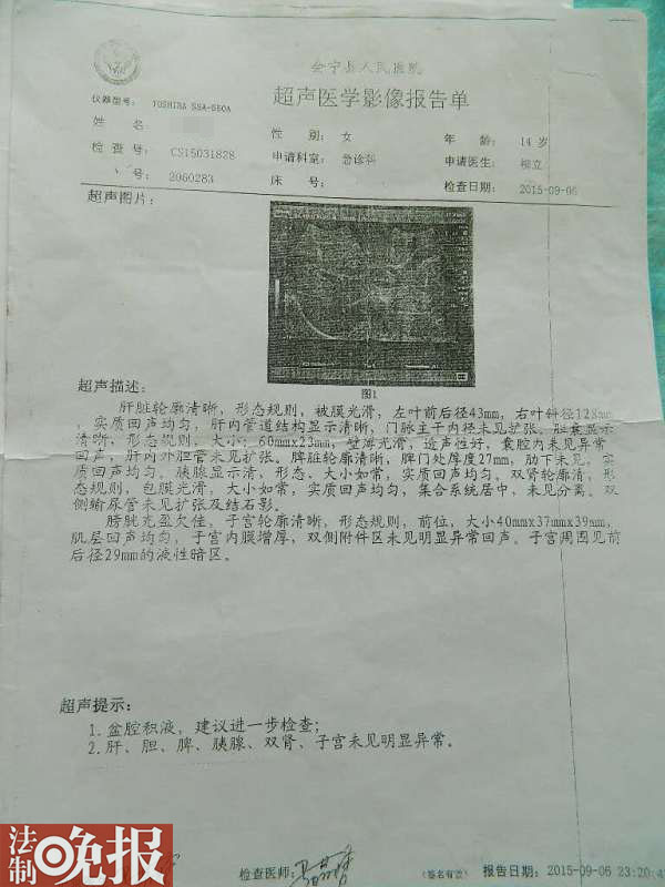 卜娟父亲卜建平则告诉法晚记者(微信公号ID:fzwb_52165216),当他从大女儿那里得知卜娟的事情后,急忙赶到学校了解具体情况,并和校方交涉。此时,吕军才出面陪卜娟及其家人在县医院做B超等仪器检查,在被诊断出盆腔炎后,医院对其进行了输液,止血消炎治疗。