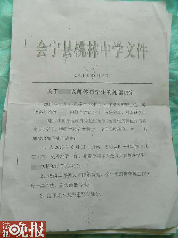 另据了解,会宁县教育局已就吕军体罚学生的行为向全县教育系统通报批评,取消当年评优选先和职称晋升资格,责令涉事桃林学校将其调岗至非教学岗位待岗培训一年。